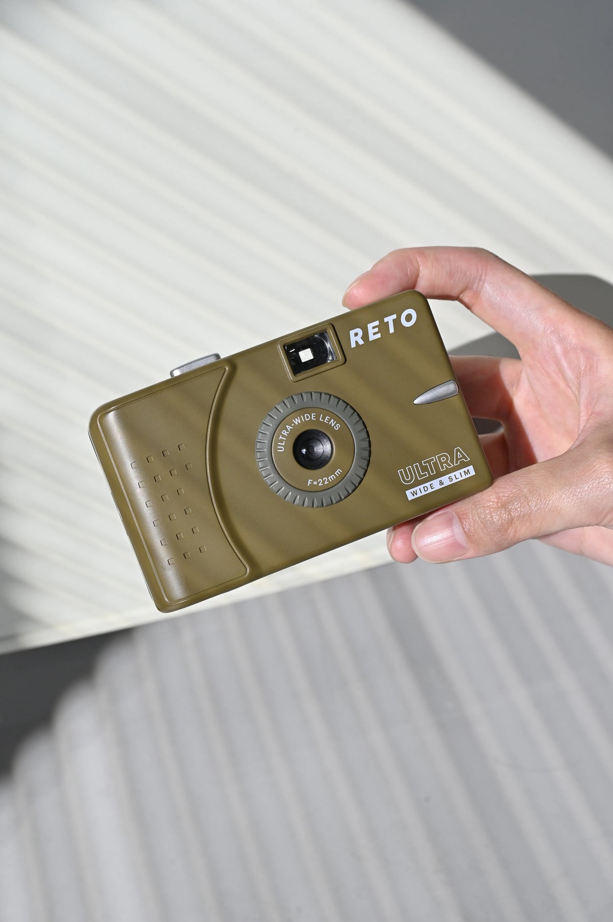 RETO Ultra Wide & Slim es una cámara de película de 35 mm delgada y liviana que cuenta con un lente ultra gran angular de 22 mm. Es una cámara divertida que cabe en el bolsillo y que puedes llevar a todas las fiestas y celebraciones.
