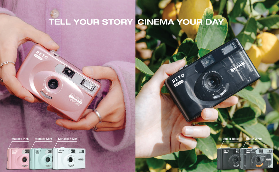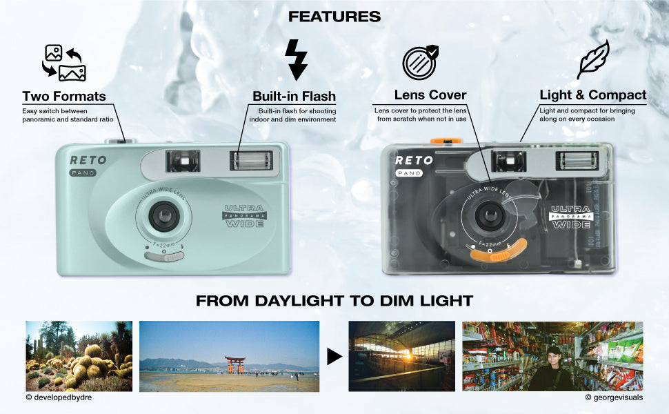 La cámara de película RETO PANO de 35 mm cuenta con un fácil cambio entre los modos estándar y cinematográfico. La lente de 22 mm ofrece una cobertura ultra gran angular para la fotografía de paisajes y viajes. ¿Senderismo por las montañas? Giro para el panorama. ¿Almuerzo con amigos? Vuelve a lo clásico. Intercambiar entre los dos modos a mitad de camino - sin pausas, sin alboroto, solo libertad creativa sin fin.